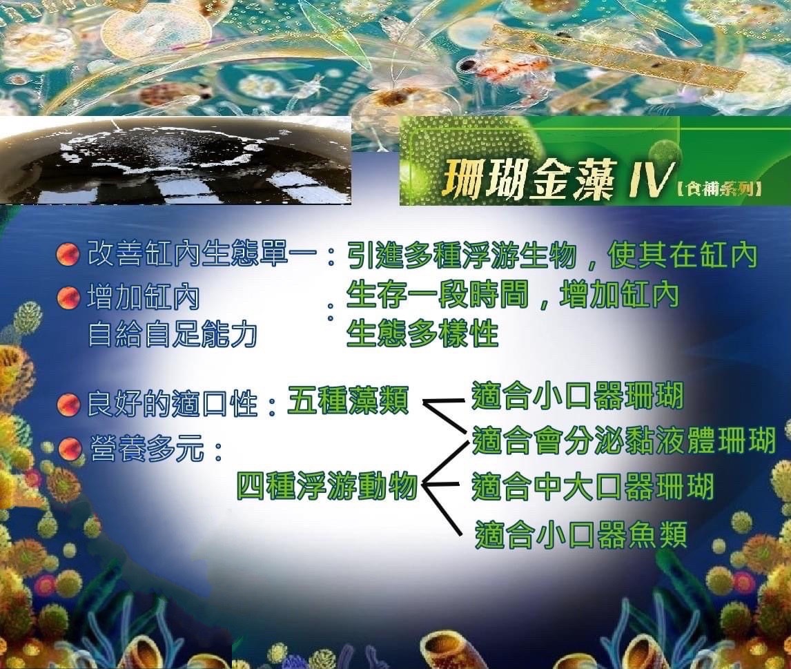 ※  內含五種藻類和四種浮游動物,適合所有口器的珊瑚,包含小口器珊瑚、會分泌黏液珊瑚 、中大口器珊瑚、小口器魚類