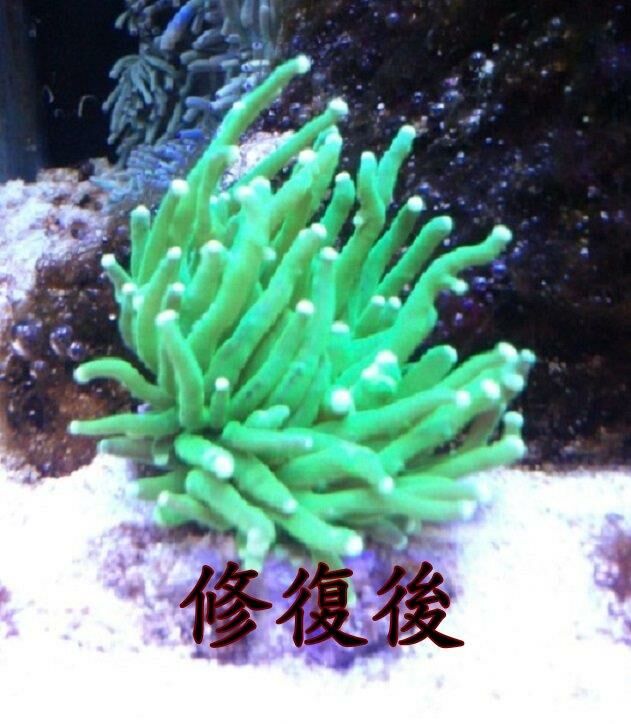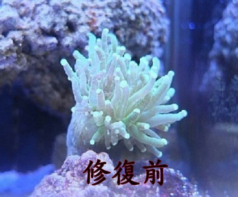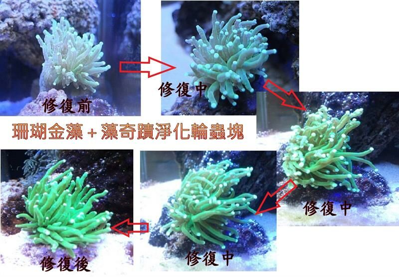 缸內米粉珊瑚明顯退色,看到海水論壇PH 8.4有很多大洋的實例見證,就來使用看看「珊瑚金藻」+「藻奇蹟淨化輪蟲塊」,沒想到使用兩個多星期後,褪色到快成白色的米粉,竟然又重新顯色了。